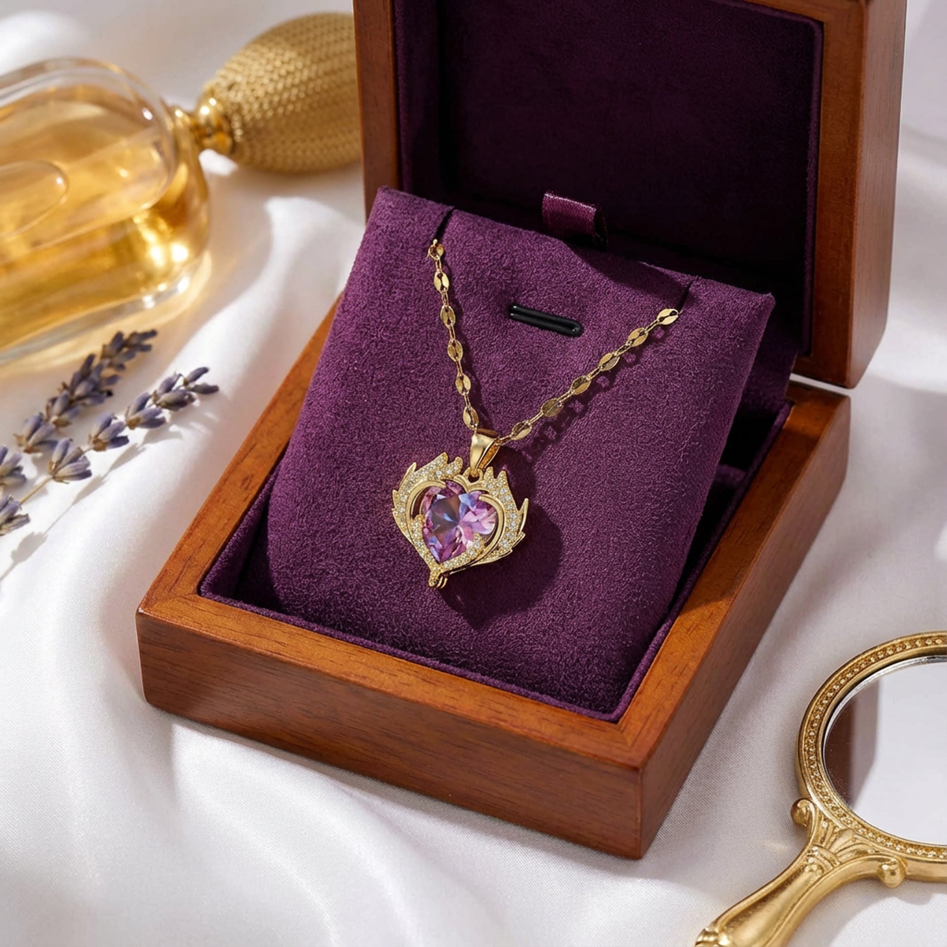 ⢠Pendant Design: Heart motif with zircon-studded angel wing accents